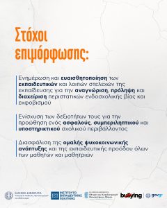 - η ενημέρωση και ευαισθητοποίηση των εκπαιδευτικών και λοιπών στελεχών της εκπαίδευσης για την αναγνώριση, πρόληψη και διαχείριση περιστατικών ενδοσχολικής βίας και εκφοβισμού,