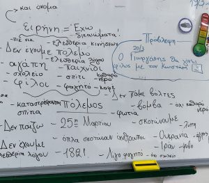 Την Παγκόσμια ημέρα παιδικού βιβλίου, οι μαθητές, αφού είχαν επεξεργαστεί τα βιβλία: “Οι ξένοι”, “Η βαλίτσα” και “Η βαλίτσα με τα μυστικά του κυρίου Μπένγιαμιν” μοιράστηκαν τις ιδέες τους για τον πόλεμο και την ειρήνη.