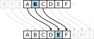 Το όνομα του μέρους όπου θα βρείτε το πρώτο στοιχείο είναι κρυπτογραφημένο με μια μέθοδο που έλεγε ο Καίσαρας ότι βρήκε εκείνος. Κάθε γράμμα το αντικαθιστούσε με αυτό που ήταν τρεις θέσεις μπροστά, πχ το A με το D, το B με το E κοκ όπως φαίνεται στο σχήμα: