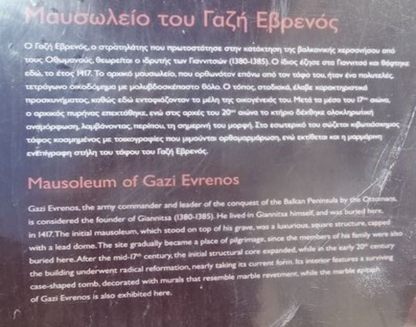 Μαυσωλείο Γαζή Εβρενός: Η περιήγηση ξεκινά από αυτό το μνημείο, το οποίο συνδέεται με τον ιδρυτή της πόλης και την ίδρυσή της. Οι μαθητές μαθαίνουν για το τοπίο του 14ου αιώνα και το ιστορικό πλαίσιο της εποχής. Επίσης, περιγράφεται το μνημείο και οι φάσεις της ιστορίας του.