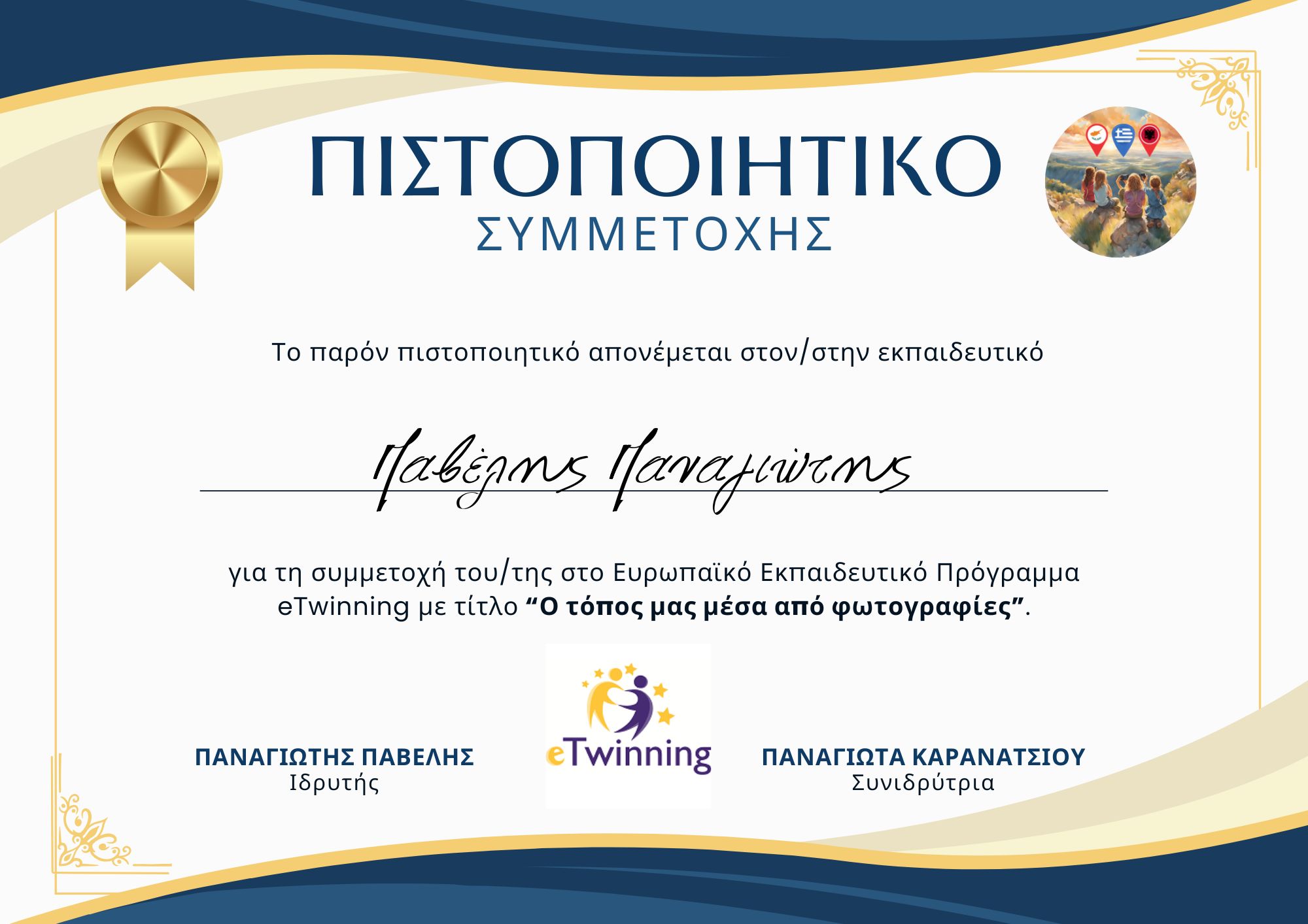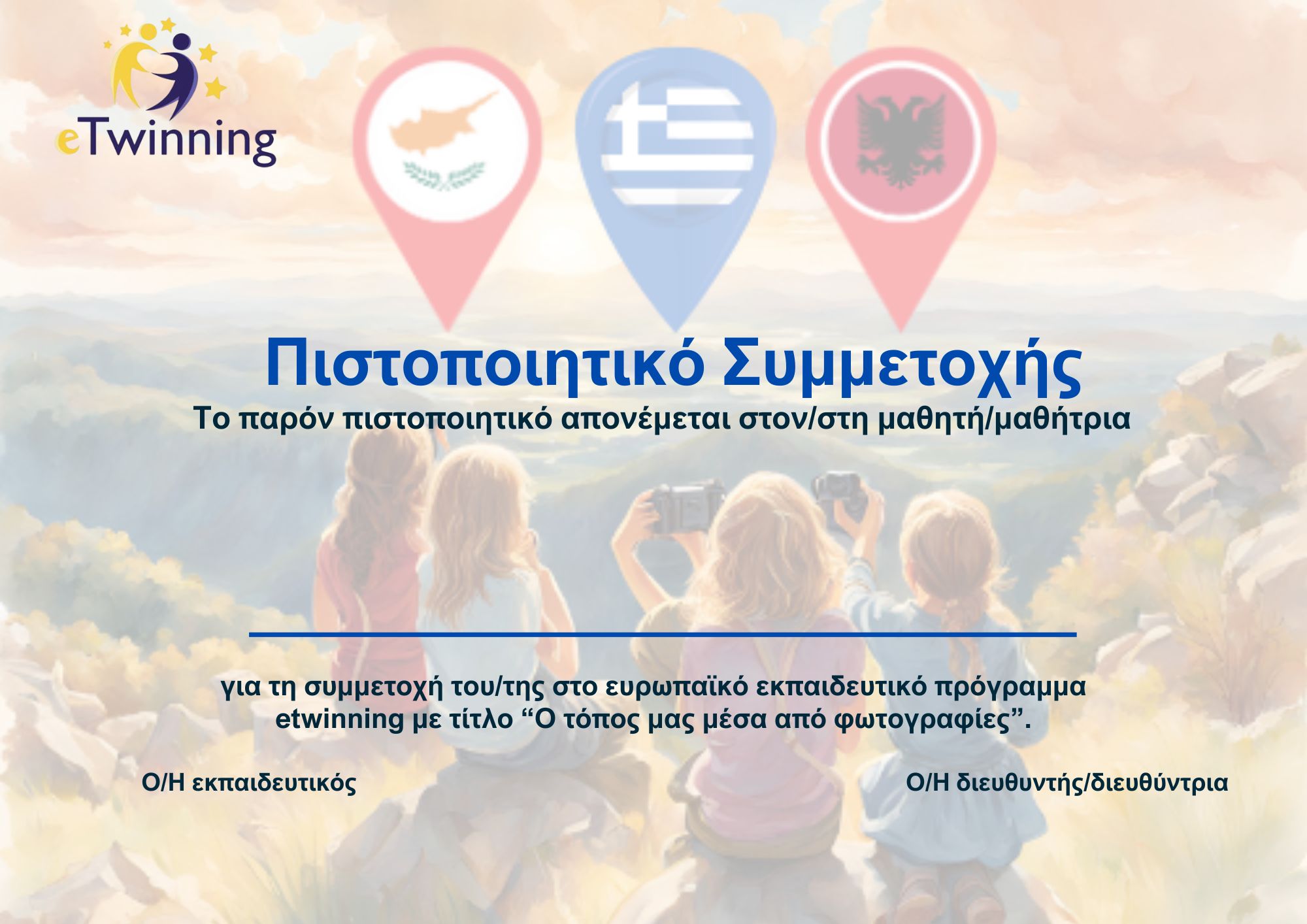 Τίτλος δράσης / προγράμματος: Ο τόπος μας μέσα από φωτογραφίες Τάξη/μαθητική ομάδα: Μαθητές ηλικίας 6-12 ετών (Δημοτικό Σχολείο) Με τη Στ΄τάξη συμμετείχαν οι εκπαιδευτικοί με ομάδες μαθητών: Παβέλης Παναγιώτης - Παπαθεοδώρου Ελένη - Λιαλιαμπίδου Αικατερίνη Συνεργάτες: Ελλάδα, Αλβανία, Κύπρος Ηλικία μαθητών: 6-12 Γλώσσα που χρησιμοποιείται: Ελληνικά Διάρκεια: 8 Μήνες ( Οκτώβριος – Μάιος) Τύπος σχολείου: Δημοτικό Είσοδος στο Twinspace: https://school-education.ec.europa.eu/en/pupil-login user name: Demo.etw Password:12