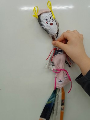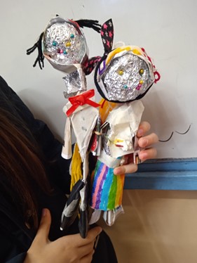 Με αφορμή αυτήν την ιστορία φτιάξαμε τις δικές μας κούκλες από εφημερίδα , η κάθε κούκλα , αφού μας είπε τ’ όνομά της, αφηγήθηκε στην τάξη μία δική της ταξιδιωτική περιπέτεια...