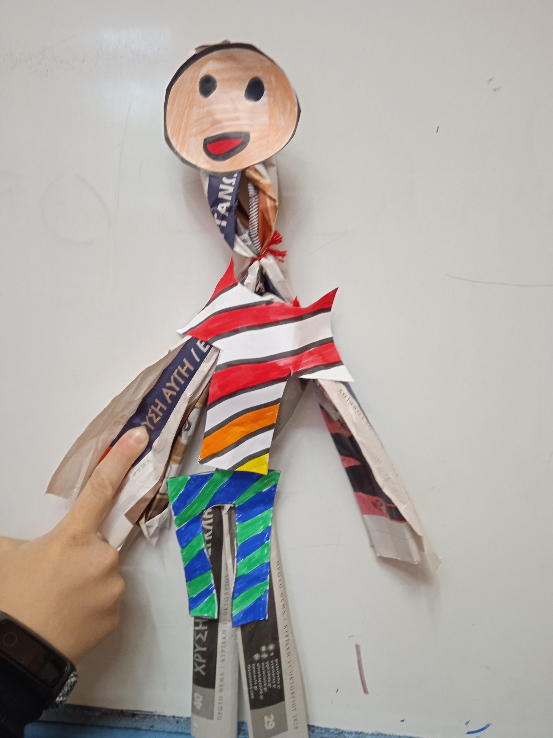 α) τις δικές του κούκλες από εφημερίδα.