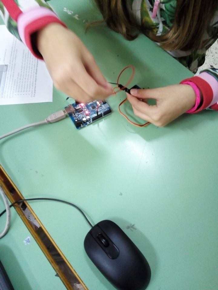 Οι μαθητές των μεγαλύτερων τάξεων κατασκεύασαν και προγραμμάτισαν μια ρομποτική κατασκευή από σερβοκινητήρα και arduino uno, η οποία χαιρετάει τον κόσμο με μια παλάμη από χαρτόνι.