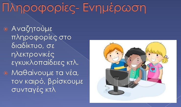 Για ποιο λόγο χρησιμοποιούμε έναν ηλεκτρονικό υπολογιστή, ένα τάμπλετ, ένα έξυπνο κινητό τηλέφωνο; Μπορούμε να δούμε μια παρουσίαση και να το μάθουμε εύκολα. Μπορείτε να τη δείτε και να την κατεβάσετε πατώντας εδώ