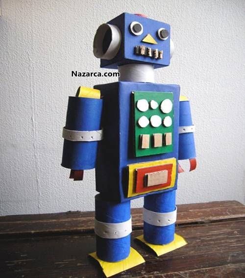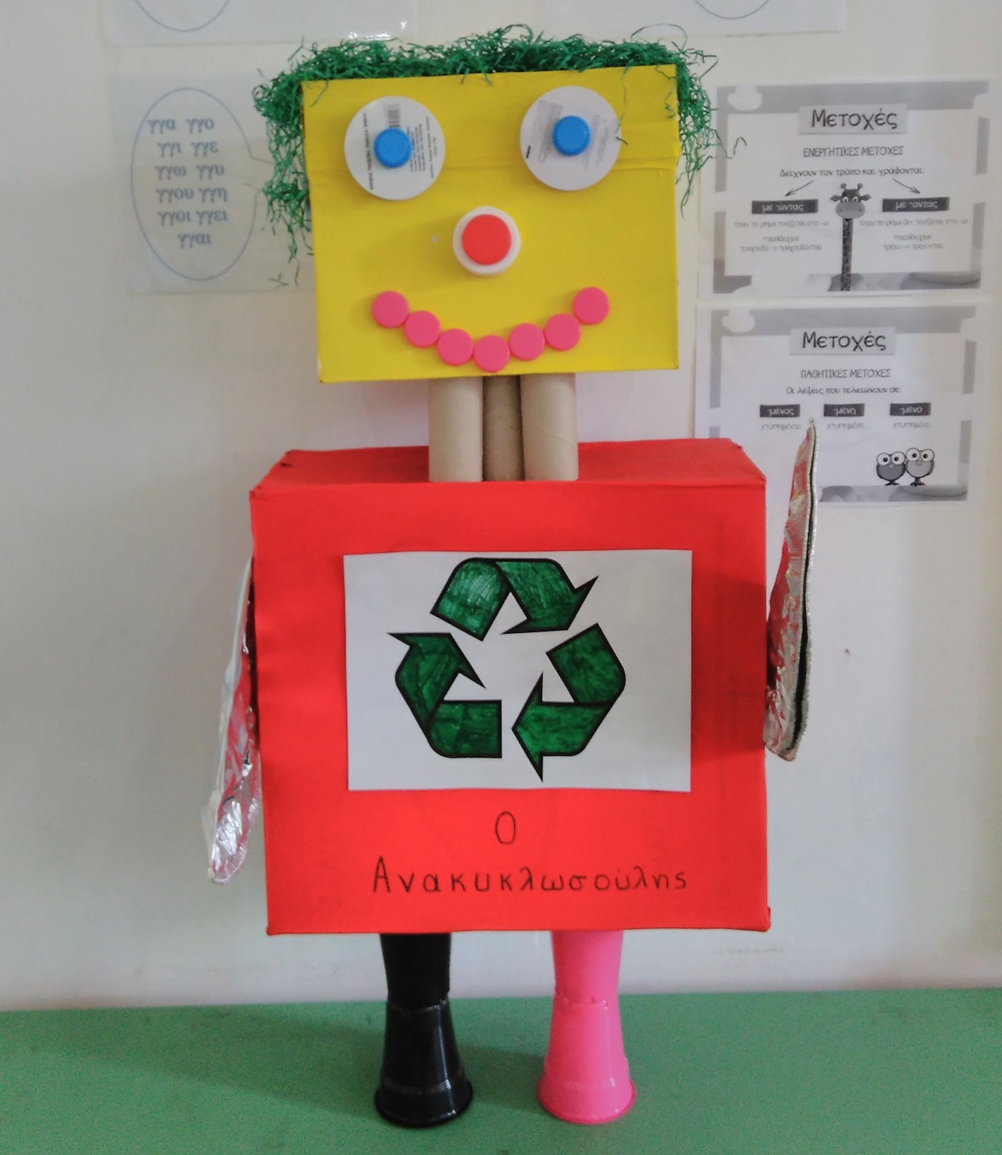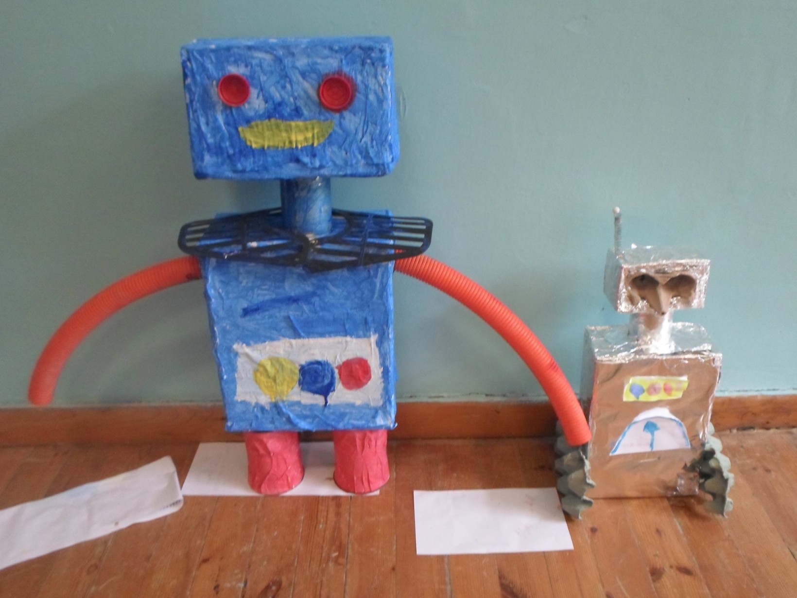Κατασκευάστε ένα ρομπότ με υλικά που έχετε σπίτι (κουτιά παπούτσια, γάλατα, ποτήρια πλαστικά ή χάρτινα, μπουκάλια, χαρτί υγείας ή κουζίνας, χαρτόνια, παλιά cd και ό,τι άλλο μπορείτε να φανταστείτε). Μπορείτε να μου στείλετε φωτογραφίες τα ρομπότ σας ώστε να φτιάξουμε ένα ωραίο κολάζ με αυτά. Πάρτε ιδέες από τις κατασκευές μαθητών άλλων σχολείων και αφήστε τη φαντασία σας να δουλέψει.
