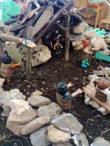Πάνω σε ένα χοντρό φύλλο φελιζόλ και σε ένα ακόμα, πιο υπερυψωμένο, χτίσαμε με αληθινές μικρές πέτρες ένα διπλό τείχος – τις πέτρες τις είχαμε μαζέψει στο περιθώριο της μικρής μας «δοκιμαστικής ανασκαφής» στο πάρκο της γειτονιάς, αλλά αυτό είναι μια άλλη ιστορία. Στο ύψωμα και το εσωτερικό του τείχους χτίσαμε ένα σπίτι με στέγη από κλαδιά, δηλαδή χαρούπια από την αγαπημένη μας χαρουπιά έξω από την τάξη. Για το έδαφος κολλήσαμε παντού αληθινό χώμα – που περίσσεψε από το σπορείο-θερμοκήπιο της τάξης μας, το οποίο είναι επίσης μια άλλη ιστορία. Τα φυτά είναι κομματάκια από πράσινα σφουγγάρια και τα μικροκεραμικά φτιαγμένα από μαθητές και μαθήτριες… όπως και τόσα άλλα που είχαν ανακαλύψει οι άνθρωποι εκείνη την εποχή, μαζί τους κι εμείς: εστία φωτιάς, ξύλινα δόρατα, λίθινα εργαλεία, σφοντύλια, εργαλεία επεξεργασίας δέρματος, και τα πρώτα κτερίσματα μιας ταφής! Όσο για τα ζώα, τα πιο εντυπωσιακά είναι ίσως οι κουβαρίστρες άσπρης κλωστής που με εξαιρετική τεχνική ένας μαθητής και οι γονείς του μετέτρεψαν σε εξημερωμένα προβατάκια. Το πιο σημαντικό είναι το αγκάλιασμα από τα παιδιά που σκέφτηκαν, έμαθαν, κατασκεύασαν, έχτισαν, και… συνεισέφεραν τα playmobil τους και διάφορα αξεσουάρ τους, τα έντυσαν με δέρματα ζώων – εν προκειμένω: καφέ μονωτική ταινία – και έπαιξαν συμβολικά-ανθρωπολογικά στο δημιούργημά τους. (Από παιδαγωγική σκοπιά έμπνευσή αποτελεί η προσέγγιση των Playworlds και οι ιδέες της Gunilla Lindqvist για τη συλλογική συμμετοχή σε έναν φανταστικό κόσμο, όπου η πραγματικότητα – εν προκειμένω, η… νεολιθική πραγματικότητα - και η φαντασία συνδέονται διαλεκτικά).