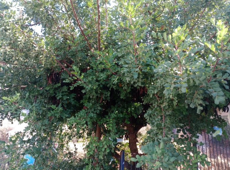 μέσ' από τις φυλλωσιές της χαρουπιάς έξω απ' την τάξη, φαίνονται μερικές φτερωτές δημιουργίες των παιδιών