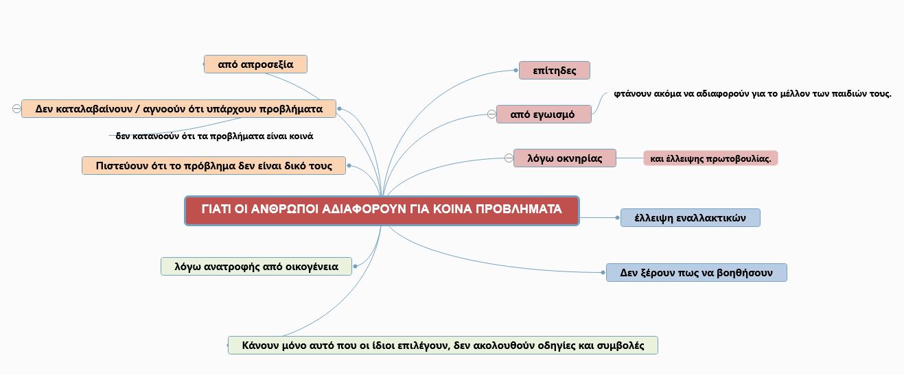 Επιπλέον, φτιάξαμε έναν ομαδικό νοητικό χάρτη από τις ιδέες που είχαν γράψει τα παιδιά σε προηγούμενη εργασία, σχετικά με το γιατί οι άνθρωποι μπορεί να μην ασχολούνται με κοινά προβλήματα.