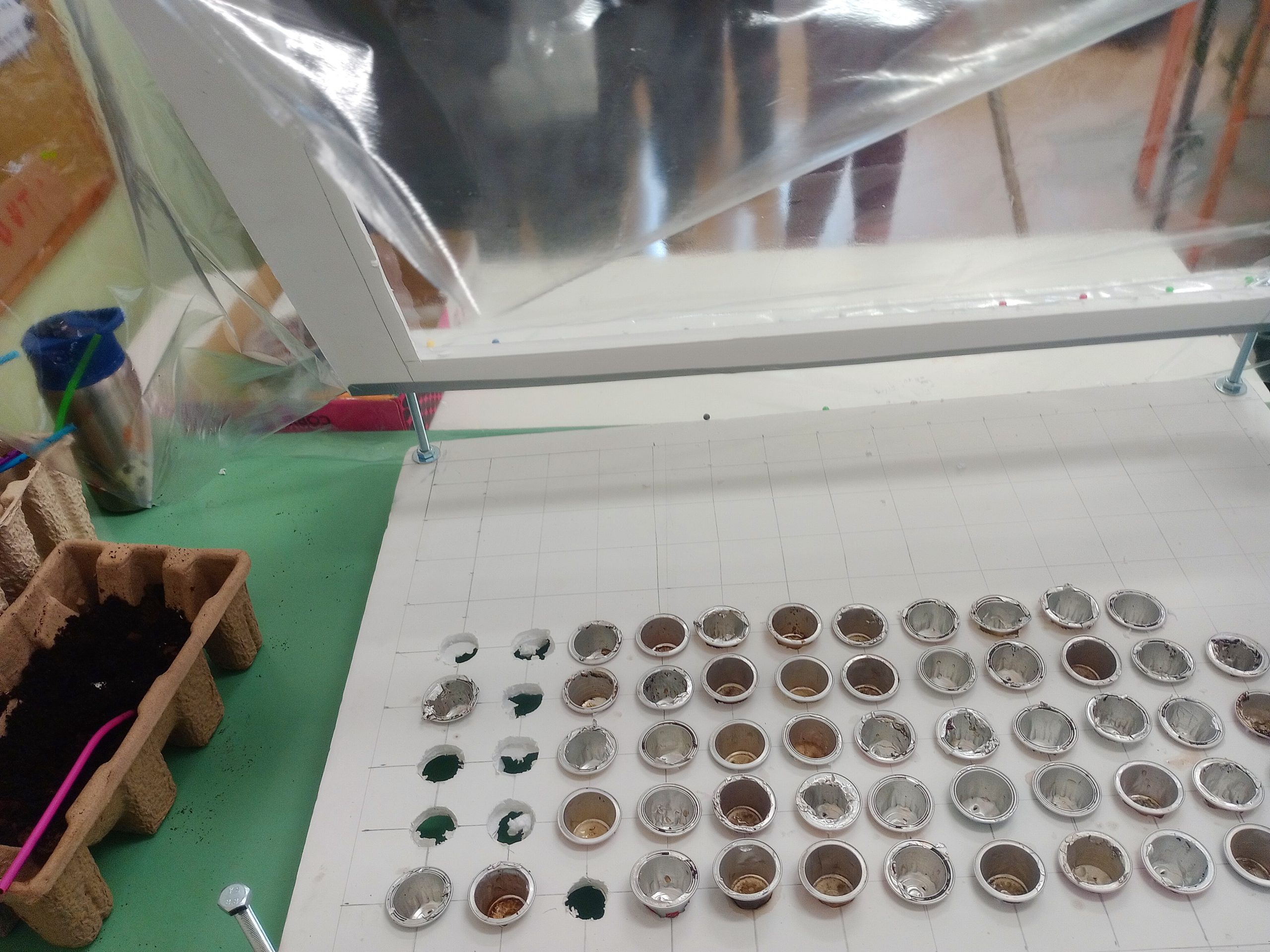 Στο Εργαστήριο Δεξιότητων χρησιμοποιώντας εργαλεία, κάνοντας τους κατάλληλους υπολογισμούς και μετρήσεις, και καθαρίζοντας και αξιοποιώντας χρησιμοποιημένα υλικά (κάψουλες εσπρέσο) προχωρήσαμε αρκετά στην κατασκευή του μικρού θερμοκηπίου-σπορείου.