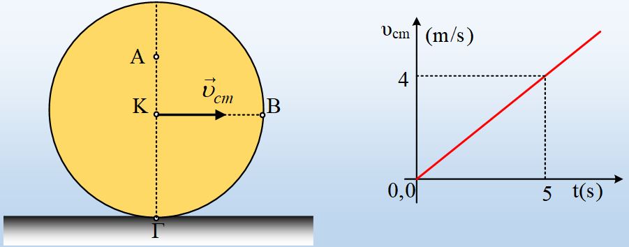 Ένας λεπτός δίσκος, ακτίνας R=0,8m αρχικά ακίνητος σε οριζόντιο επίπεδο, δέχεται κατάλληλη δύναμη οπότε αρχίζει να κυλίεται (χωρίς να ολισθαίνει). Στο πρώτο σχήμα βλέπετε τον κυλιόμενο δίσκο, ενώ στο δεύτερο δίνεται η ταχύτητα του κέντρου του Κ (και κέντρου μάζας του), σε συνάρτηση με το χρόνο.