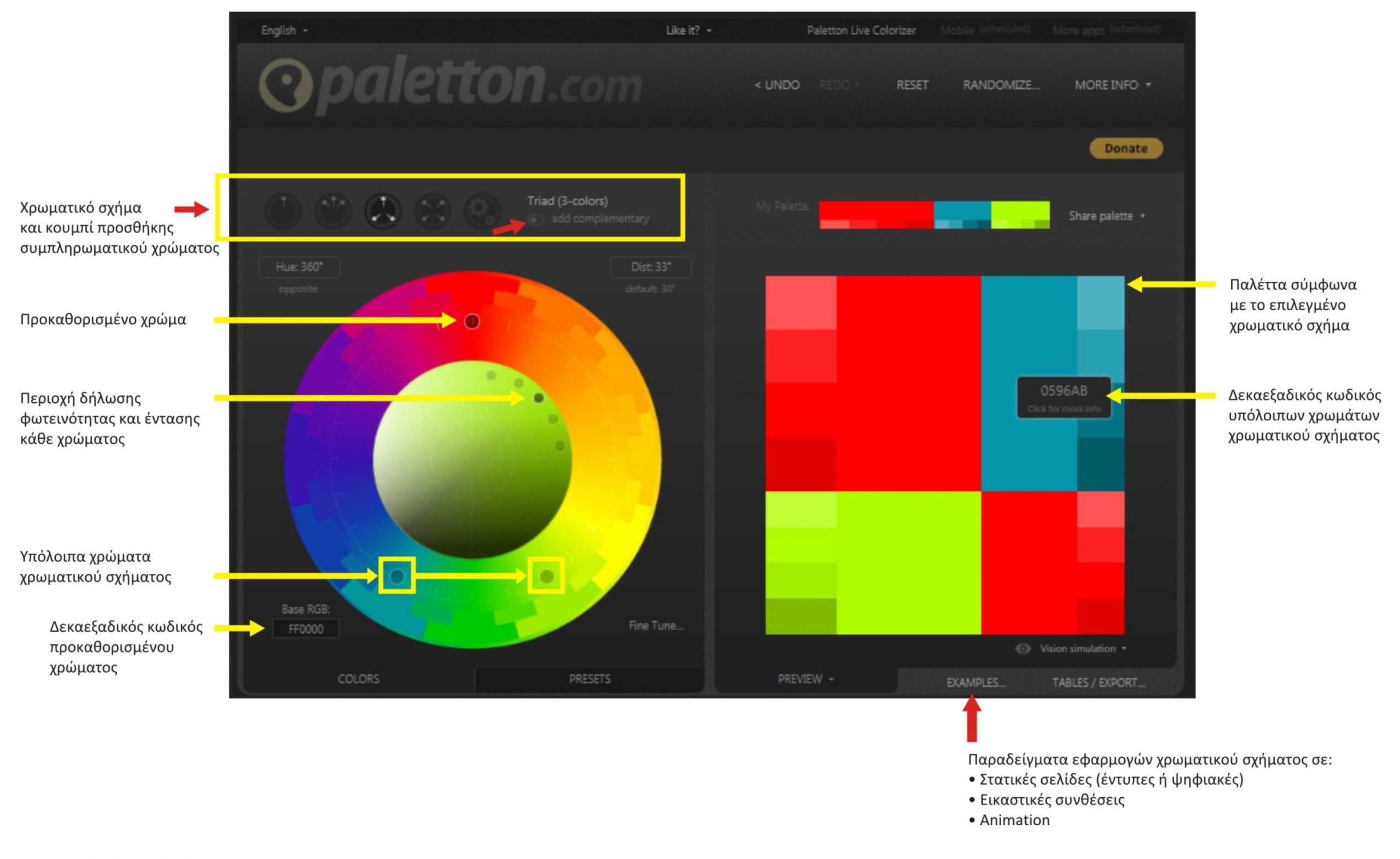 Paletton: Mια εξειδικευμένη διαδικτυακή εφαρμογή σχεδιασμού χρωματικών σχημάτων, η οποία βασίζεται στις αρχές της θεωρίας των χρωμάτων και του χρωματικού κύκλου. Δείτε εδώ και συμβουλευθείτε την παρακάτω εικόνα με τις επεξηγήσεις.