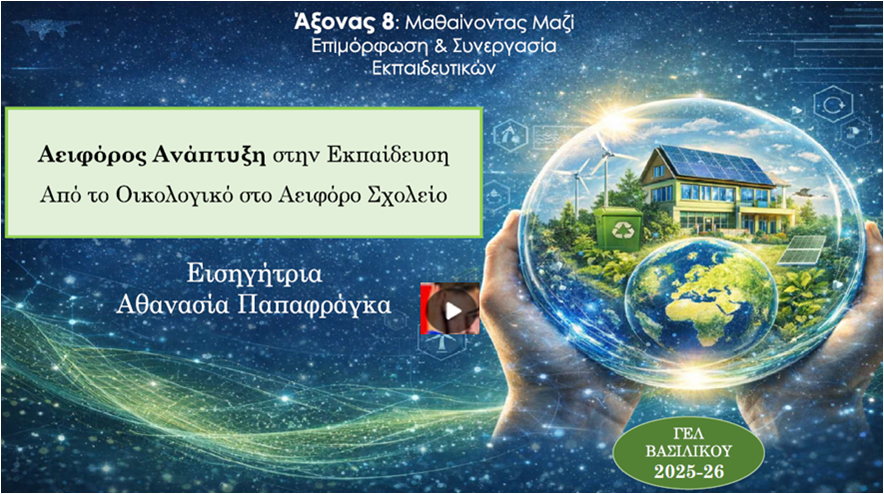 Στο πλαίσιο του Άξονα 8 «Μαθαίνοντας Μαζί: Επιμόρφωση και Συνεργασία Εκπαιδευτικών», πραγματοποιήθηκε σήμερα στο σχολείο μας επιμορφωτική δράση με θέμα την Αειφόρο Ανάπτυξη στην Εκπαίδευση.