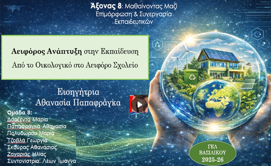 Το ΓΕΛ Βασιλικού και η ομάδα του άξονα 8 της εσωτερικής αξιολόγησης, ανταποκρινόμενο στις σύγχρονες εκπαιδευτικές ανάγκες και στις κατευθύνσεις του Υπουργείου Παιδείας για την προώθηση της Αειφόρου Ανάπτυξης, υλοποίησε επιμόρφωση με τίτλο: