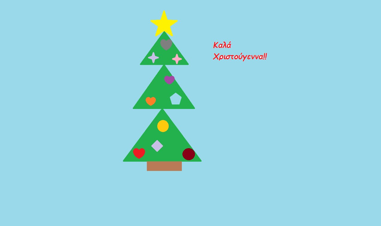 Χρησιμοποιώντας τα τρίγωνα, το ορθογώνιο και τα υπόλοιπα σχήματα της ζωγραφικής, ζωγραφίστε μια χριστουγεννιάτικη κάρτα όπως η παρακάτω. Μη ξεχάσετε να ευχηθείτε "Καλά Χριστούγεννα!!", χρησιμοποιώντας το πλαίσιο κειμένου της Ζωγραφικής:
