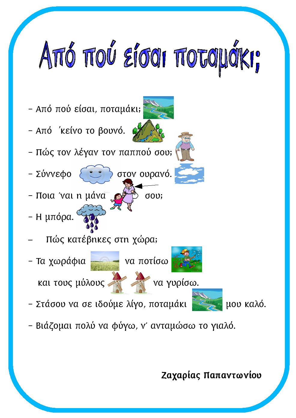 Αφού ακούσουμε το τραγούδι "Το ποταμάκι", πατώντας εδώ, ανοίγουμε το MS Word και πληκτρολογούμε τους στίχους του ποιήματος. Έπειτα χρωματίζουμε το κείμενο μας όπως μας αρέσει, και τέλος, τοποθετούμε μία εικόνα δίπλα σε κάθε πρόταση, ανάλογα με το κείμενο, όπως παρακάτω: