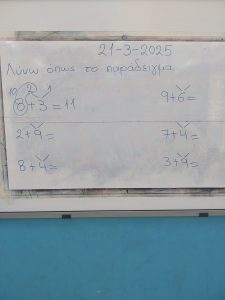 Μαθηματικά: Τα παιδιά κάνουν πολύ καλή επανάληψη τα ζευγαράκια του 10 και μετά λύνουν την άσκηση στο μπλε τετράδιο των μαθηματικών όπως το παράδειγμα.