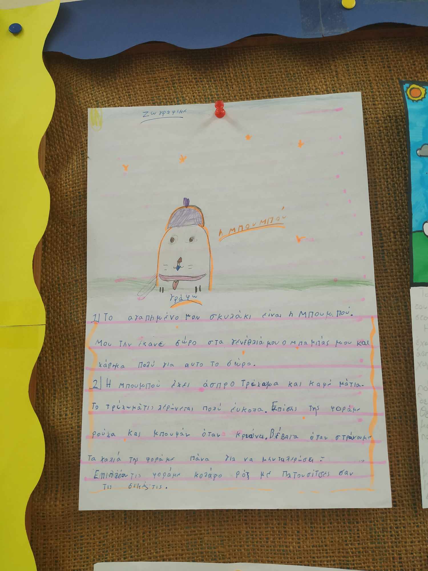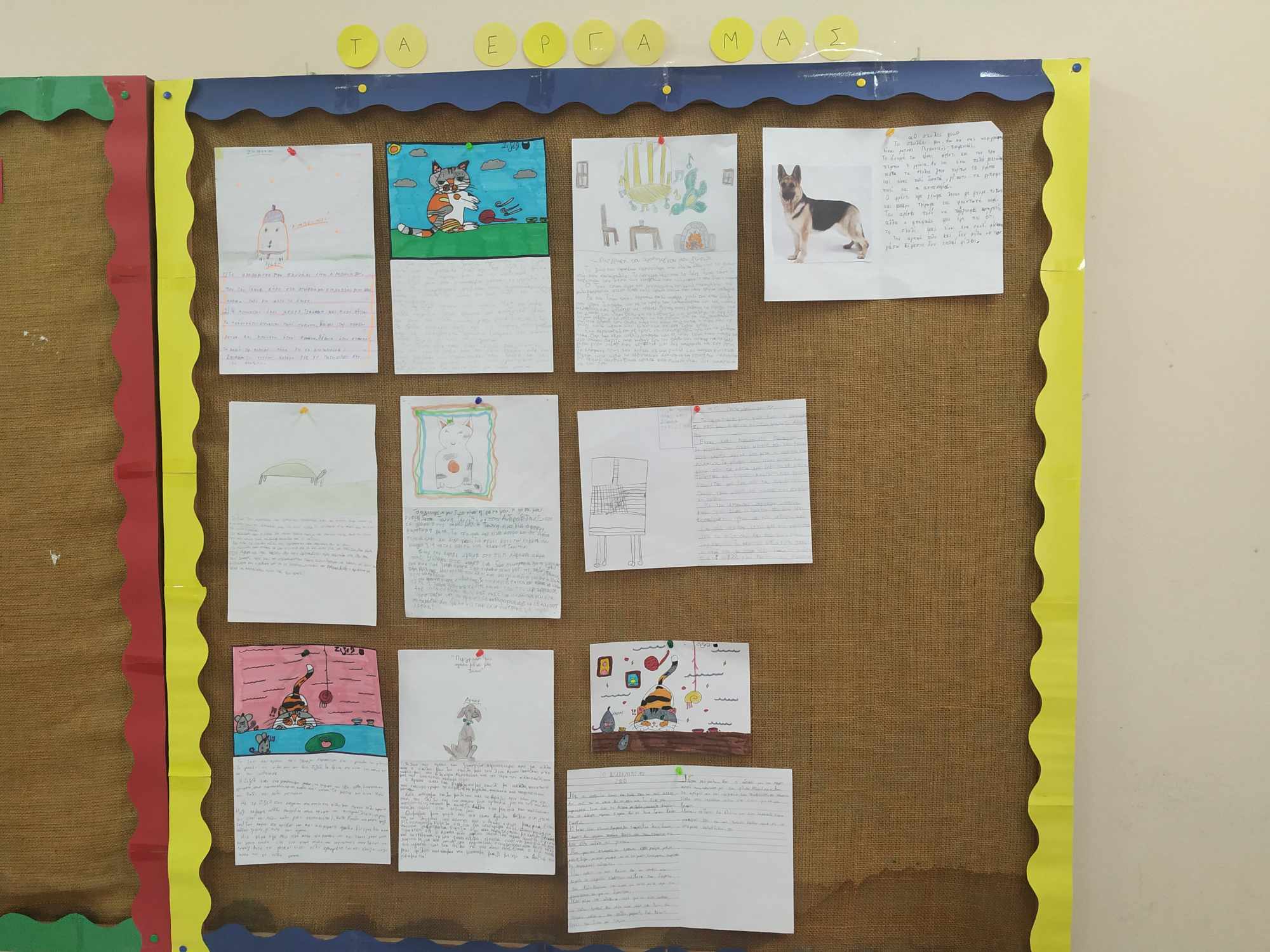 Στην ενότητα 4 «Τα ζώα που ζουν κοντά μας», οι μαθητές διδάσκονται το κειμενικό είδος της περιγραφής. Στο πλαίσιο αυτής της ενότητας, κλήθηκαν να περιγράψουν το κατοικίδιο ζώο τους και να αποτυπώσουν με λέξεις τα χαρακτηριστικά του, τη συμπεριφορά του και τις ιδιαίτερες συνήθειές του. Οι μαθητές εργάστηκαν ατομικά, γράφοντας τα κείμενά τους τα οποία και συνόδευσαν με ζωγραφιές, προσφέροντας έτσι μια πιο ζωντανή και πλήρη εικόνα του ζώου που περιέγραφαν. Μέσα από αυτή τη δραστηριότητα, τα παιδιά είχαν την ευκαιρία να βελτιώσουν τις περιγραφικές τους ικανότητες και να εκφράσουν την αγάπη και την φροντίδα τους για τα ζώα. Τα κείμενα και οι ζωγραφιές τους παρουσιάστηκαν στην τάξη, με κάθε μαθητή να μοιράζεται την περιγραφή του κατοικίδιού του και να εξηγεί τη σχέση που έχει μαζί του.