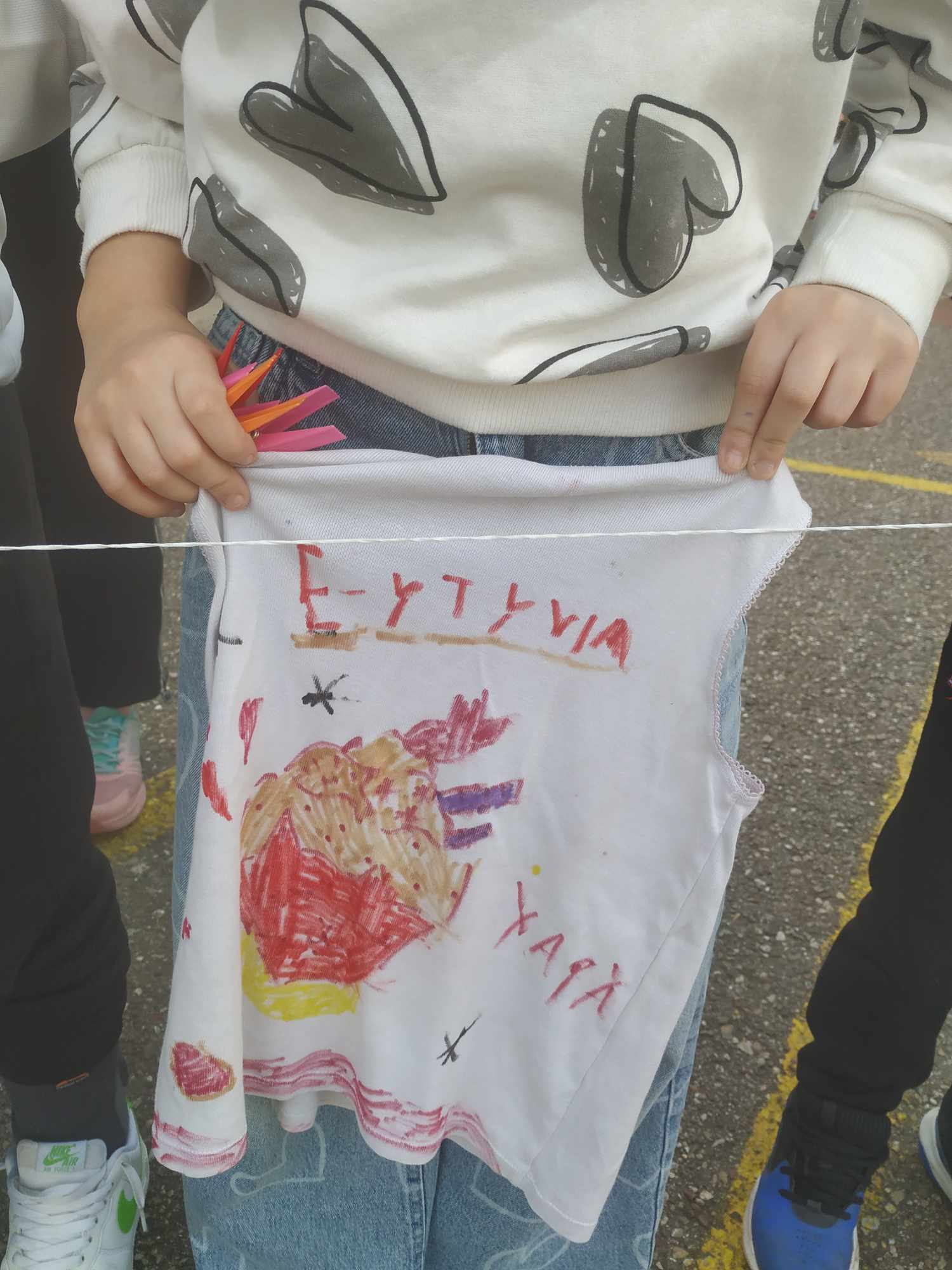 Το τμήμα μας συμμετείχε στη δράση «Απλώνω Ευτυχία δυναμώνω τη ΦΛΟΓΑ στην καρδιά». Πρόκειται για μια πρωτοβουλία η οποία έχει ως σκοπό να ευαισθητοποιηθούν τα παιδιά γύρω από έννοιες, όπως: η ευτυχία, η προσφορά, η αλληλεγγύη. Στο πλαίσιο αυτής της δράσης διαβάσαμε και επεξεργαστήκαμε το έργο του Oscar Wilde "Ο Ευτυχισμένος Πρίγκιπας", που μας δίδαξε τη δύναμη της ανιδιοτελούς προσφοράς και τη σημασία της βοήθειας στους άλλους. Η ιστορία αυτή αποτέλεσε την αφορμή για να αναγνωρίσουμε ποια είναι τα πράγματα που μας κάνουν ευτυχισμένους. Υπό την καθοδήγηση της δασκάλας των εικαστικών του σχολείου μας ζωγραφίσαμε με ανεξίτηλους μαρκαδόρους πάνω σε λευκά t-shirt, όσα μας κάνουν ευτυχισμένους, από μικρές χαρές της καθημερινότητας, μέχρι τα όνειρά μας για έναν καλύτερο κόσμο. Συνειδητοποιήσαμε ότι γύρω μας υπάρχουν άνθρωποι που αντιμετωπίζουν δυσκολίες στη ζωή τους που τους εμποδίζουν από το να νιώσουν ευτυχισμένοι. Αποφασίσαμε να μη μείνουμε θεατές και να λάβουμε δράση συγκεντρώνοντας χρήματα για τη "Φλόγα", έναν οργανισμό που στηρίζει παιδιά που αντιμετωπίζουν σοβαρά προβλήματα υγείας και τις οικογένειές τους. Δημιουργήσαμε καταλόγους με καλές πράξεις η υλοποίηση των οποίων θα μας απέφερε ένα μικρό χρηματικό αντίτιμο που θα μας έφερνε πιο κοντά στον στόχο μας, να ενισχύσουμε την ευτυχία των άλλων. Κατασκευάσαμε κουμπαράδες στους οποίους θα συγκεντρώναμε τα χρήματα. Με ιδιαίτερη συγκίνηση παραδώσαμε τα χρήματα που συγκεντρώσαμε κατά τη διάρκεια των χριστουγεννιάτικων διακοπών μας στον εκπρόσωπο της Φλόγας που επισκέφθηκε το σχολείο μας και απλώσαμε τη δική μας μπουγάδα ευτυχίας. Με αυτή τη δράση, επιδιώξαμε να αναδείξουμε τη σημασία της αλληλεγγύης και να μεταδώσουμε στα παιδιά του σχολείου μας την αξία του να προσφέρουμε στους άλλους, κάνοντάς τους μέρος ενός σημαντικού σκοπού.