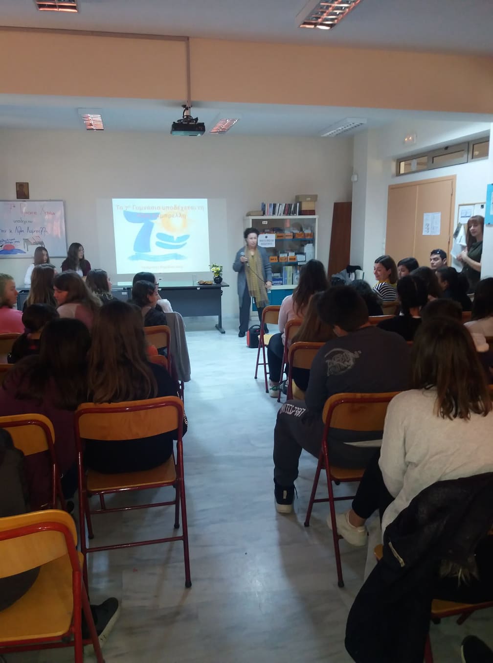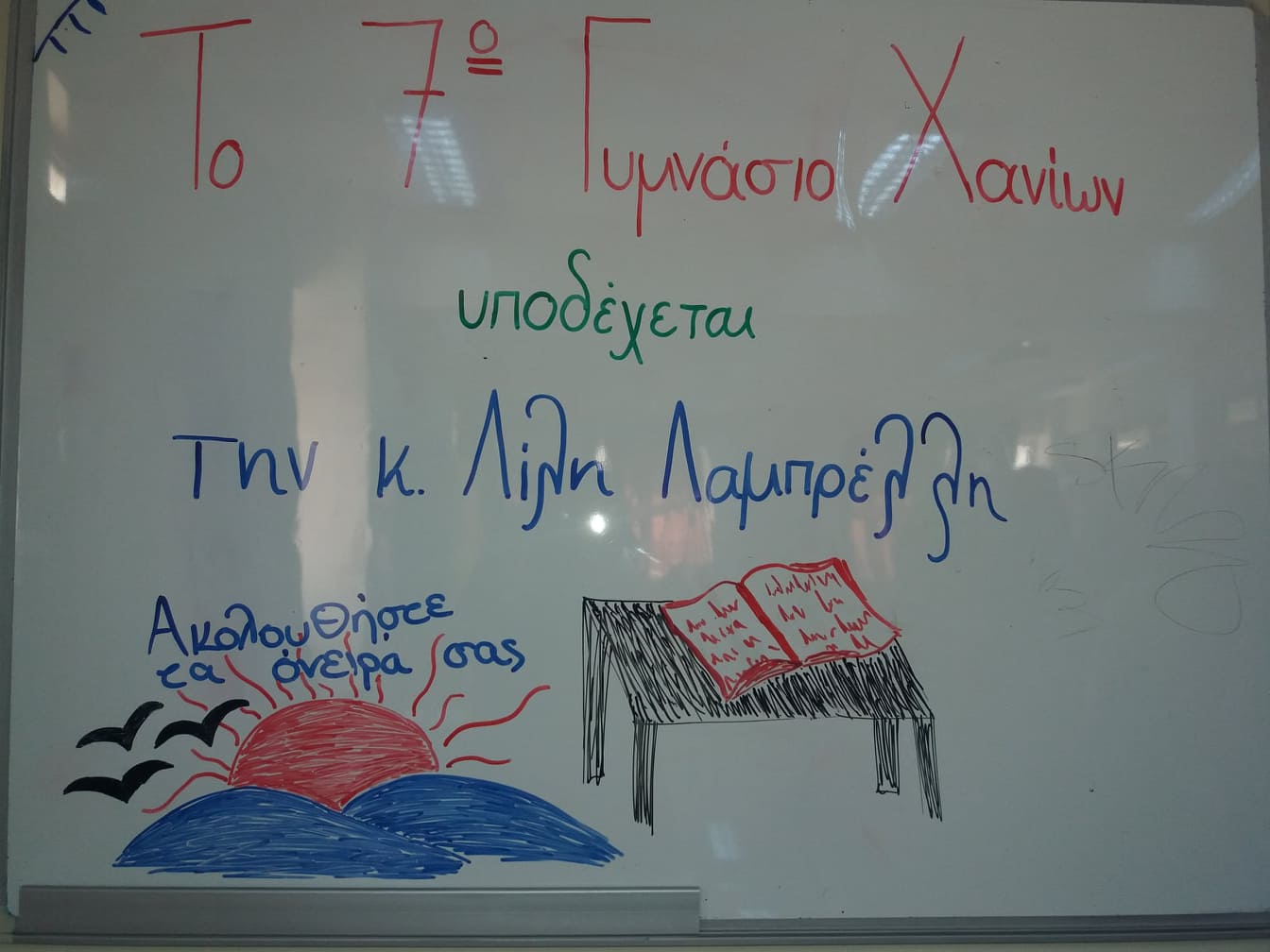 Η Α΄ Τάξη του 7ου Γυμνασίου Χανίων υποδέχτηκε τη Τετάρτη 17 Απριλίου 2019 στη βιβλιοθήκη του σχολείου τη συγγραφέα και αφηγήτρια λαϊκών παραμυθιών κ. Λιλή Λαμπρέλλη.