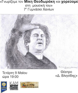 "Γνωρίζομε τον Μίκη Θεοδωράκη και χορεύομε στη μουσική του" που θα παρουσιαστεί στο θέατρο "Δημήτρης Βλησίδης" την Τετάρτη 9 Μαΐου 2018 στις 19:00 μ.μ..