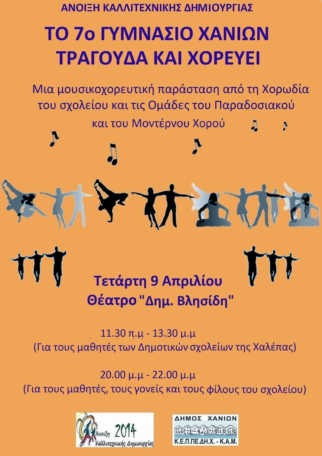 Στο πλαίσιο των εκδηλώσεων «Άνοιξη Καλλιτεχνικής Δημιουργίας 2014», που συνδιοργανώνουν ο Δήμος Χανίων και η ΚΕΠΠΕΔΗΧ-ΚΑΜ σε συνεργασία με τις Διευθύνσεις Πρωτοβάθμιας και Δευτεροβάθμιας Εκπαίδευσης, το Πολυτεχνείο και το ΤΕΙ Κρήτης και άλλους φορείς πολιτισμού της πόλης, το 7ο Γυμνάσιο Χανίων παρουσιάζει τη Τετάρτη 9 Απριλίου 2014 στο θέατρο «Δημ. Βλησίδης» στις 11.30 π.μ.-13.30 μ.μ. και στις 19.30 μ.μ.-21.30 μ.μ. τη μουσικοχορευτική παράσταση «ΤΟ 7ο ΓΥΜΝΑΣΙΟ ΧΑΝΙΩΝ ΤΡΑΓΟΥΔΑ ΚΑΙ ΧΟΡΕΥΕΙ !».