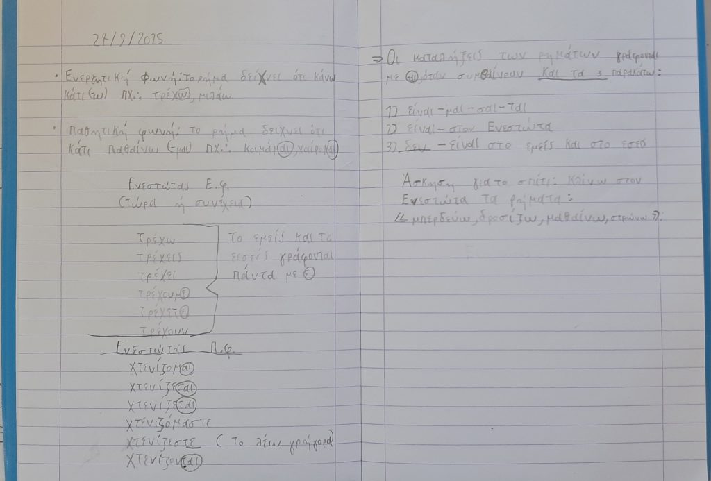 - Άσκηση στο τετράδιο: Κλίνω στον Ενεστώτα τα ρήματα μπερδεύω, δροσίζω, μαθαίνω, στρώνω. Δεν είναι ανάγκη να γράφονται τα πρόσωπα μπροστά από κάθε ρήμα.