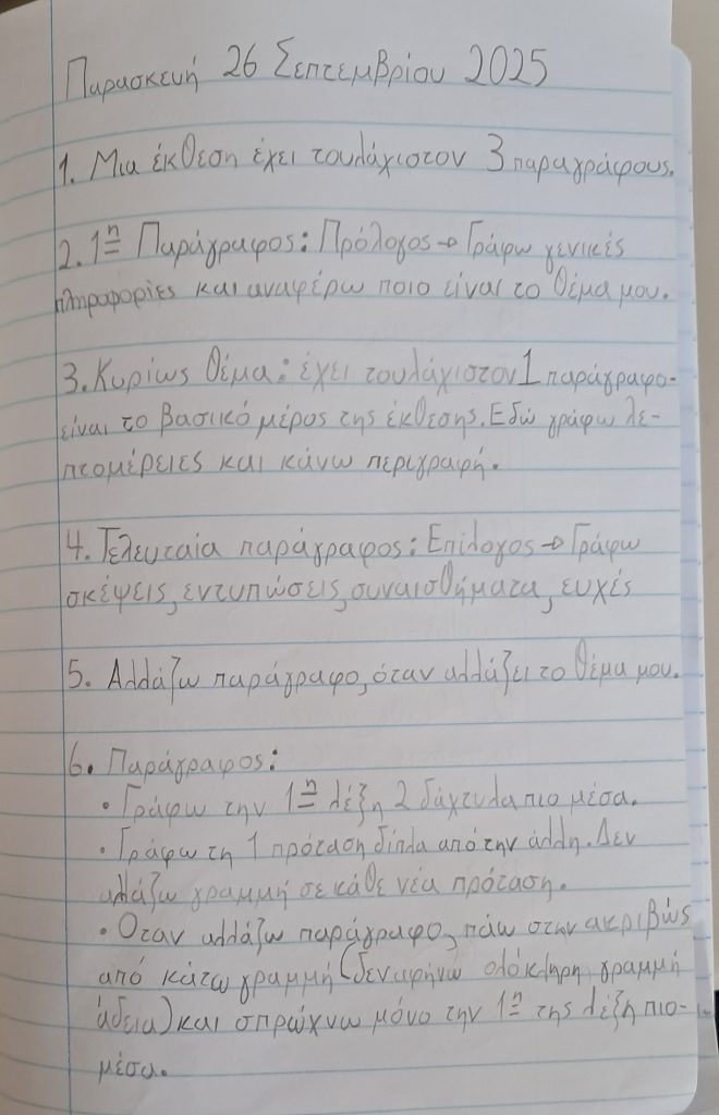 - Δε γράφω κάπου την έκθεση (οι εκθέσεις θα γίνονται πάντα στην τάξη στο τετράδιο παραγωγής γραπτού λόγου).