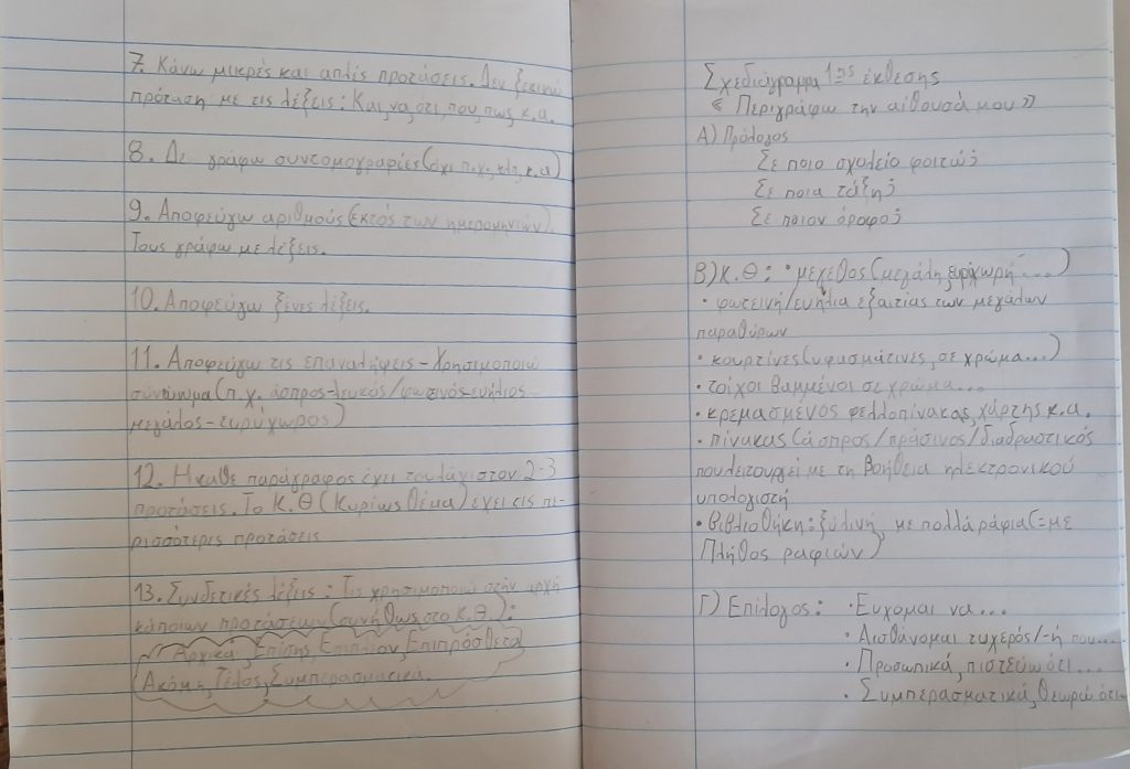 - Μελετώ τις σημειώσεις και το σχεδιάγραμμα της έκθεσης στο τετράδιο παραγωγής γραπτού λόγου και προετοιμάζομαι για την έκθεση που θα γράψουμε τη Δευτέρα με θέμα "Περιγράφω την αίθουσά μου".