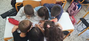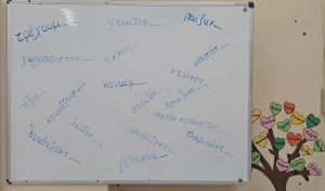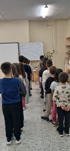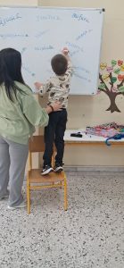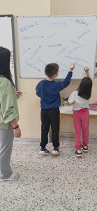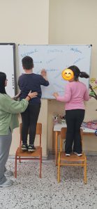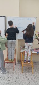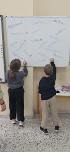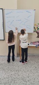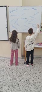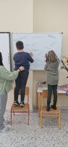 ΓΛΩΣΣΑ: Σήμερα παίξαμε παιχνίδι! Σκυταλοδρομία ορθογραφίας, λοιπόν, για να εξασκηθούμε στις καταλήξεις -ε και -αι των ρημάτων! Στον πίνακα μας περίμεναν διάσπαρτα ρήματα με κενά στις καταλήξεις τους. Τα παιδιά, χωρισμένα σε δύο ομάδες, έτρεχαν διαδοχικά, προκειμένου να συμπληρώσουν τις καταλήξεις σε όσο το δυνατόν περισσότερα ρήματα. Η κάθε ομάδα, έχοντας για σκυτάλη τον δικό της, αντιπροσωπευτικό σε χρώμα, μαρκαδόρο, προσπαθούσε να συλλέξει τους περισσότερους πόντους.