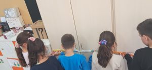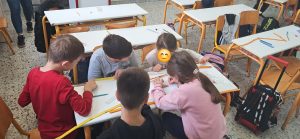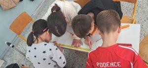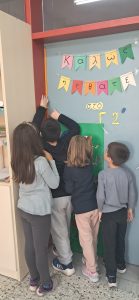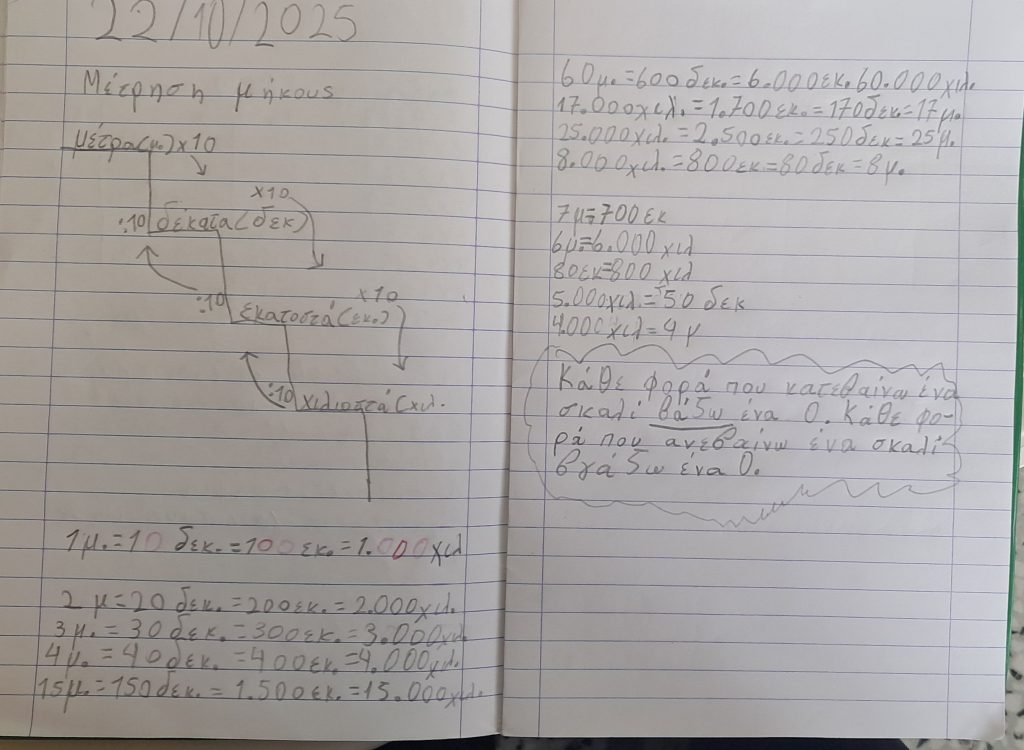 ΜΑΘΗΜΑΤΙΚΑ: Γράψαμε στο τετράδιο. Παράλληλα, τα παιδιά, χωρισμένα σε ομάδες, έκαναν μετρήσεις μήκους στην τάξη, χρησιμοποιώντας το γαλλικό τους μέτρο. Τέλος, μοιράστηκαν διορθωμένα τα επαναληπτικά.
