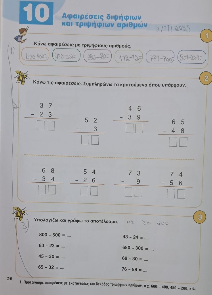 ΜΑΘΗΜΑΤΙΚΑ: Κάναμε τις σελ. 30-31 Β.Μ., τη σελ. 26 Τ.Ε. και γράψαμε στο τετράδιο.