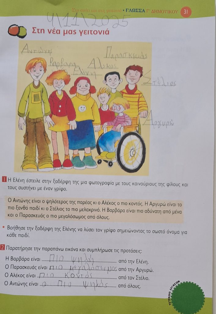 ΓΛΩΣΣΑ: Κάναμε τις σελ. 31- 32 Τ.Ε. και γράψαμε στο τετράδιο.
