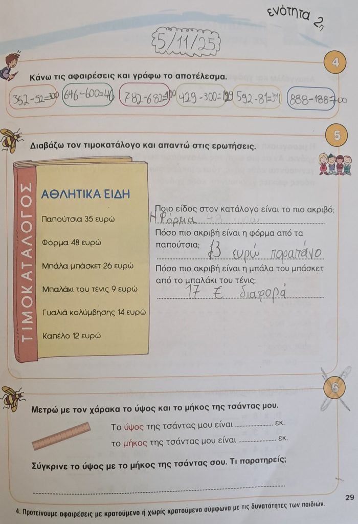 ΜΑΘΗΜΑΤΙΚΑ: Κάναμε τη σελ. 29 Τ.Ε. και γράψαμε στο τετράδιο.
