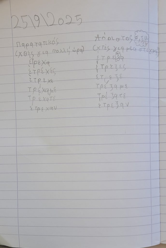 - Αντ. (1 φορά) και Ορθ.: το ρήμα "είμαι" και το ρήμα "έχω" σε Ενεστώτα και Παρατατικό (Τα έχουμε γράψει στο τετράδιο) --> Τα παιδιά θα πρέπει να είναι σε θέση να γνωρίζουν πώς κλίνονται τα συγκεκριμένα βοηθητικά ρήματα.