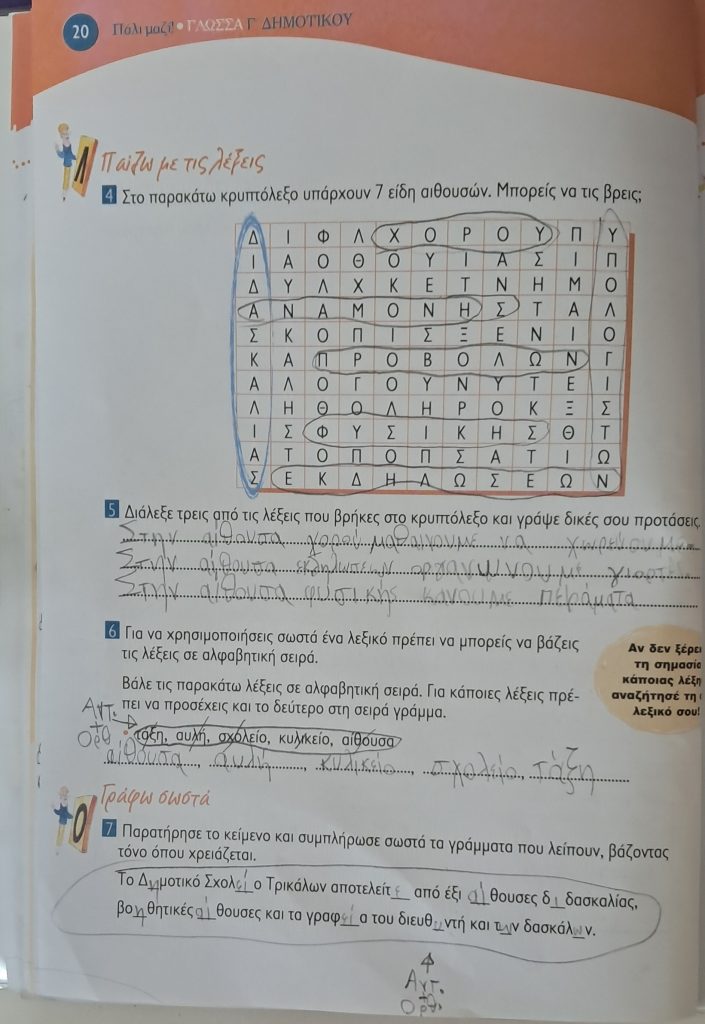 - Αντ. (1 φορά) και Ορθ. τις κυκλωμένες λέξεις- φράσεις της σελ. 26 Β.Μ. (αίθουσα εκδηλώσεων, αυλή, βιβλιοθήκη, γραφείο διευθυντή, γυμνάζομαι, ηλεκτρονικός υπολογιστής, θρανίο, κασετίνα, μολύβι, ξύστρα, σβήνω, ψαλίδι)