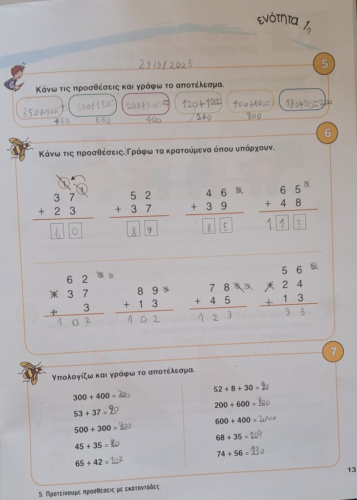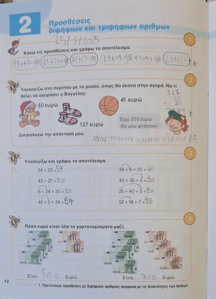 ΜΑΘΗΜΑΤΙΚΑ: Κάναμε τη σελ. 12 Τ.Ε. και γράψαμε στο τετράδιο. Εστιάζουμε στην ονομασία και τη σωστή γραφή των αριθμών. Παράλληλα, επιμένουμε στην εκτέλεση προσθέσεων με τον νου.