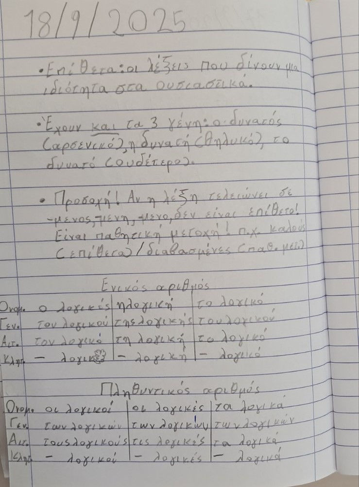 ΓΛΩΣΣΑ: Κάναμε επανάληψη στα επίθετα στο τετράδιο.