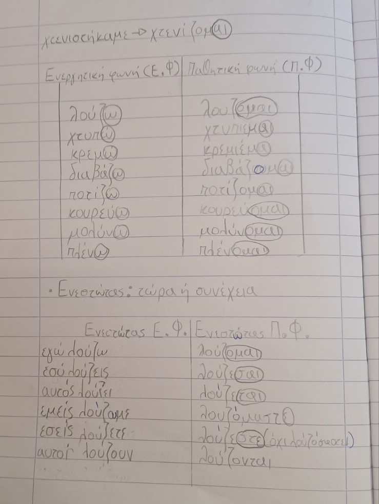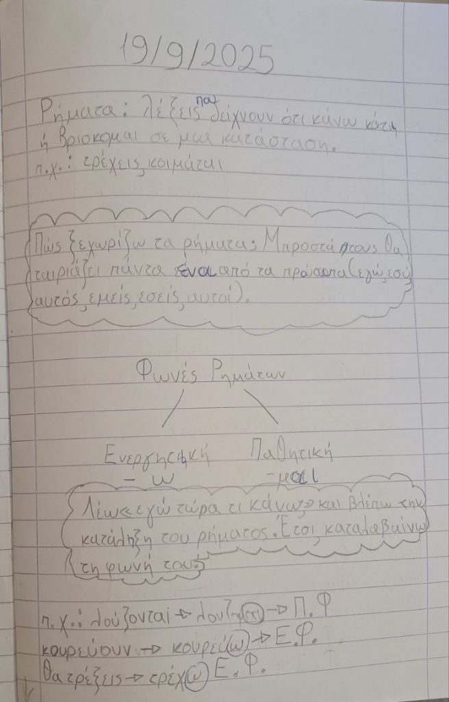 ΓΛΩΣΣΑ: Ασχοληθήκαμε στο τετράδιο με τα ρήματα (αναγνώριση, φωνές ρημάτων, Ενεστώτας Ενεργητικής και Παθητικής φωνής).