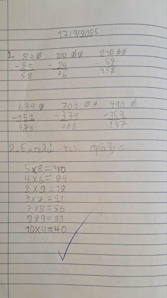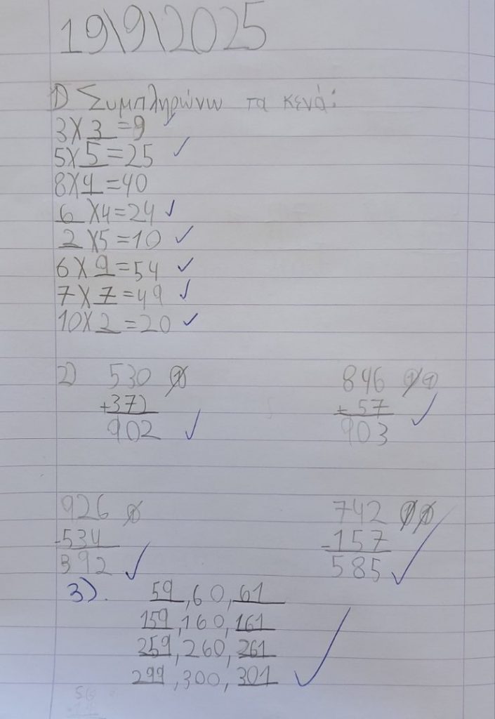 ΜΑΘΗΜΑΤΙΚΑ: Κάναμε ασκήσεις στο τετράδιο. Επιμένουμε σε προσθαφαιρέσεις και προπαίδειες.