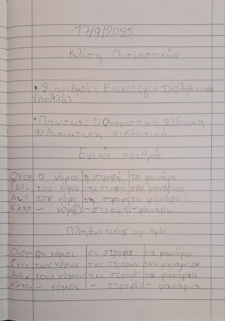ΓΛΩΣΣΑ: Ασχοληθήκαμε με κλίση ουσιαστικών στο τετράδιο.