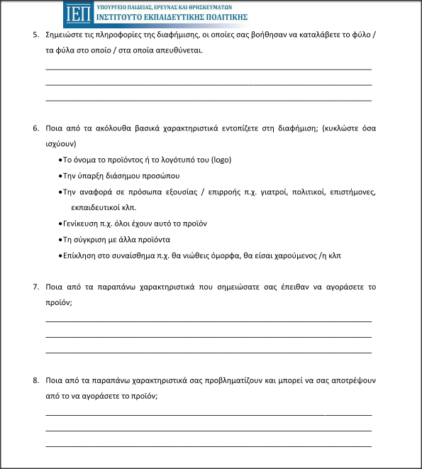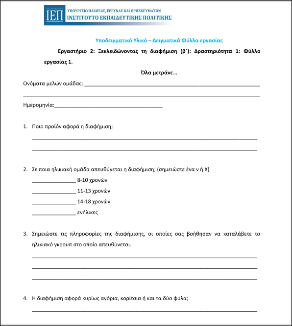 α)Πάρτε τα παρακάτω φύλλα εργασίας και συμπληρώστε τα για κάθε μία διαφήμιση με την οποία ασχοληθήκατε στο προηγούμενο εργαστήριο.