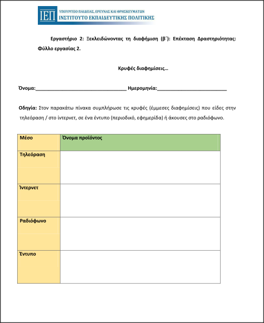 Καταγράψτε έμμεσες διαφημίσεις στο παρακάτω φύλλο εργασίας