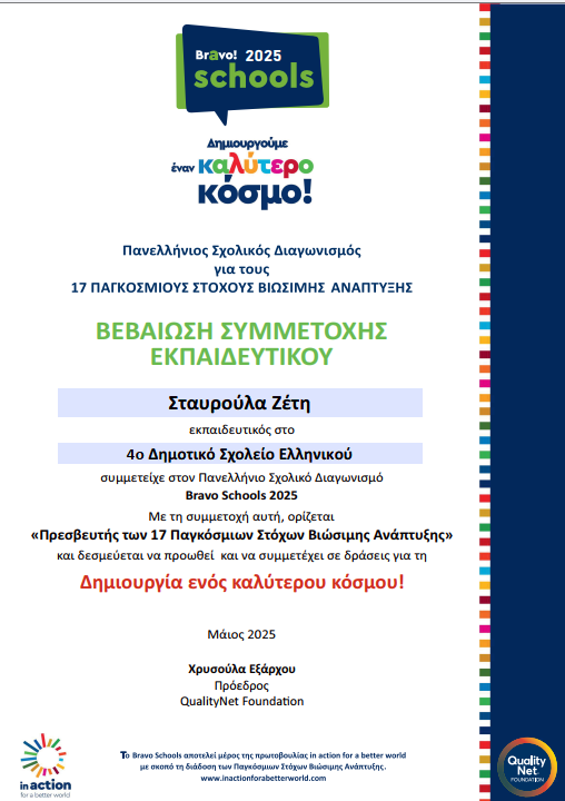 Έπαινος στο σχολείο για Bravo Schools 2025