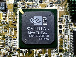 The RIVA TNT2 is a graphics processing unit manufactured by Nvidia starting in early 1999. The chip is codenamed "NV5" because it is the 5th graphics chip design by Nvidia, succeeding the RIVA TNT (NV4). RIVA is an acronym for Real-time Interactive Video and Animation accelerator.[1] The "TNT" suffix refers to the chip's ability to work on two texels at once (TwiN Texel).[2] Nvidia removed RIVA from the name later[when?] in the chip's lifetime.[2]