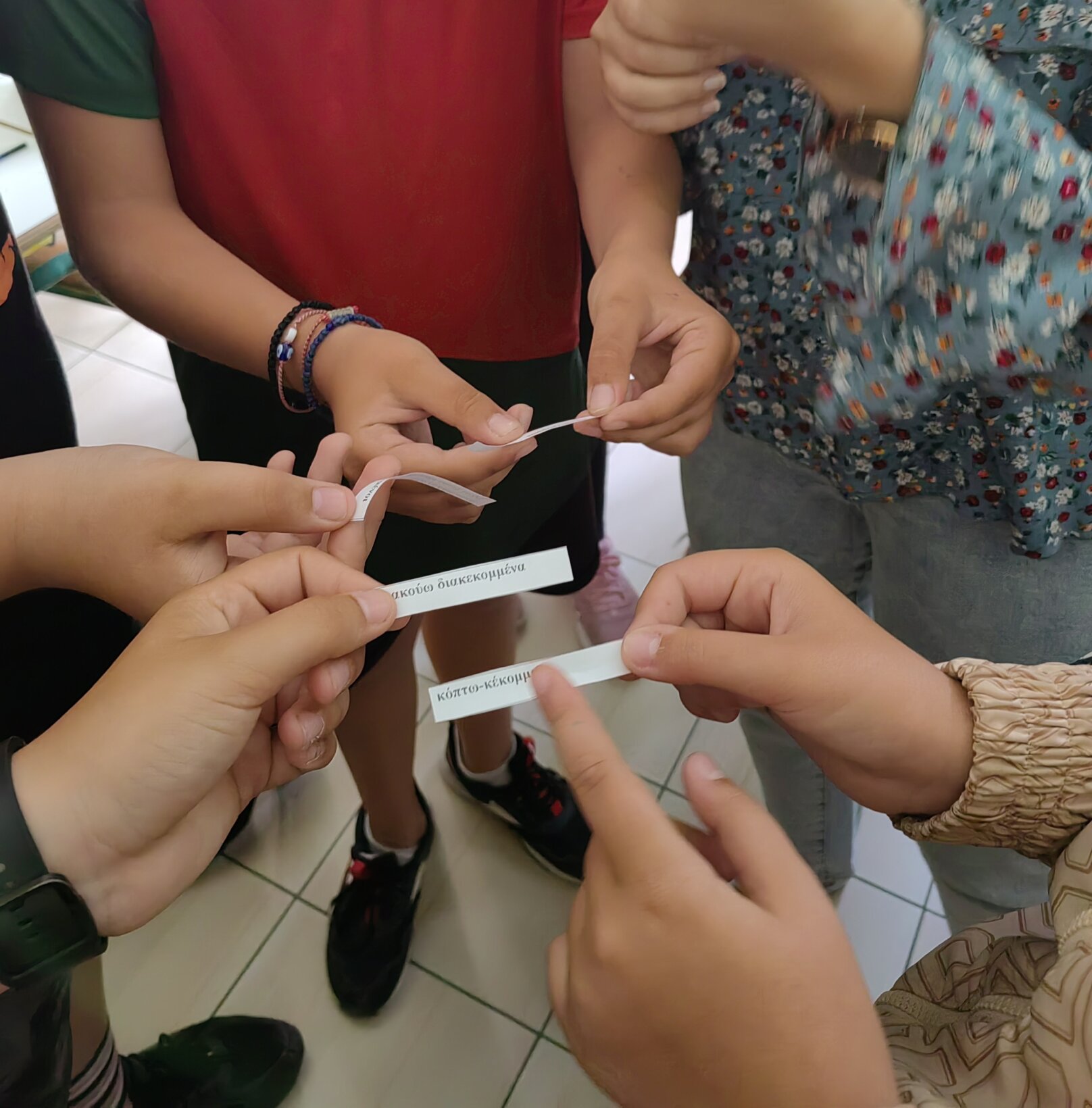 Και στο τέλος κάθε παιδί τυχαία είχε χαρτάκι με ρήμα και φράσεις στα αρχαία και έπρεπε να τρέξουν να βρουν το ζευγαράκι τους στα αρχαία.