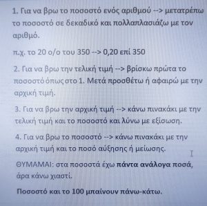 Στο τετράδιο μαθηματικών σημειώσαμε περιληπτικά όσα χρειάζεται για να λύσουμε προβλήματα ποσοστών. Δες τη διπλανή εικόνα.