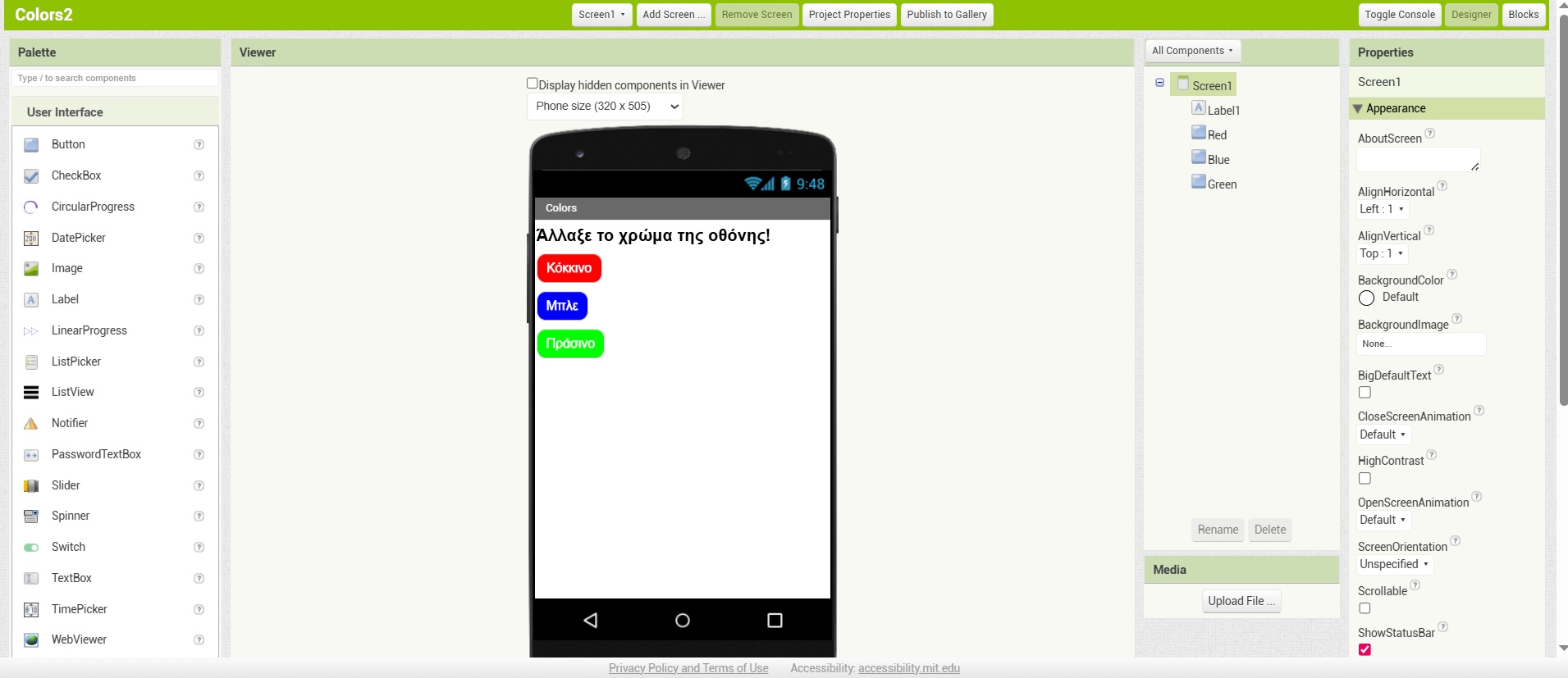 Παρακάτω σας δίνονται οι οδηγίες για τη δημιουργία με το App Inventor μιας απλής εφαρμογής με όνομα Colors, στην οποία ο χρήστης θα μπορεί να αλλάξει το χρώμα της οθόνης, διαλέγοντας ανάμεσα σε τρία διαθέσιμα χρώματα.