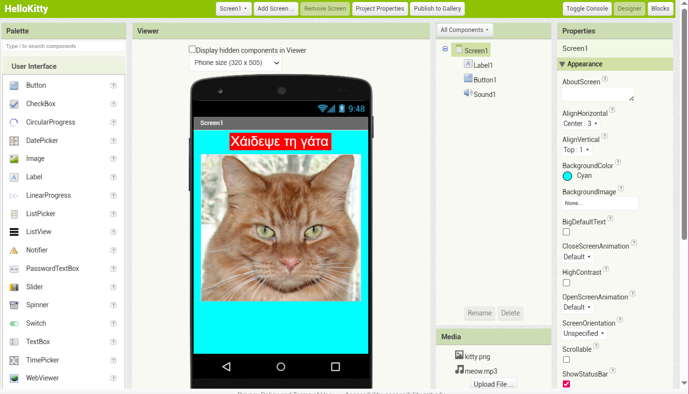 Παρακάτω σας δίνονται οι οδηγίες για τη δημιουργία με το App Inventor μιας απλής εφαρμογής, στην οποία θα εμφανίζεται η εικόνα μιας γάτας ως ένα κουμπί, το οποίο εάν πατήσετε η γάτα θα νιαουρίζει, ενώ ταυτόχρονα θα παράγεται στο κινητό δόνηση για 1 δευτερόλεπτο.